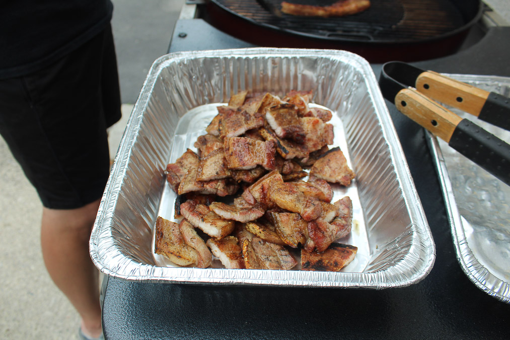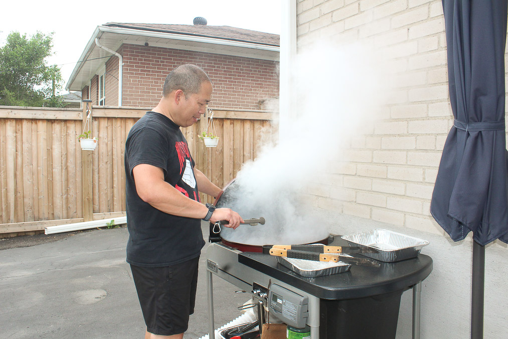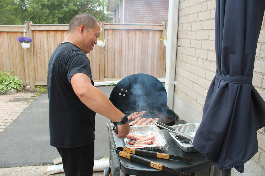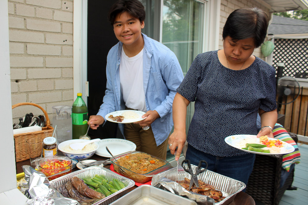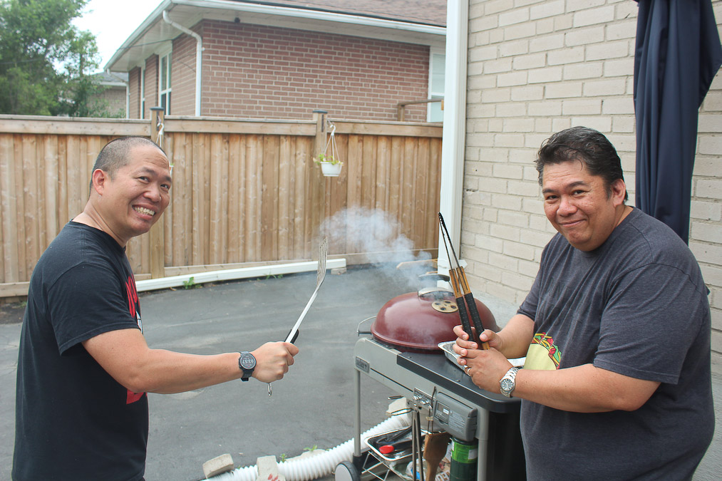 At the heart of our family get-togethers, aside from the funny stories, is the food! In the 11 years my family had been here, and 14 years for theirs, we have graduated from pizza. Erich told us that there are Asian markets that we could go to to shop for Asian, including Filipino, ingredients. He brought us to B Trust. It was just a few minutes from where they lived then. We were amazed. There is tilapia, Mang Tomas lechon sauce, chicharon, Granny Goose Tortillos, and even bagoong! Knowing that we can buy Filipino ingredients in Toronto lessened how much we miss the home we left behind. Somehow the flavors, and aroma, of home are here in our new home. The only challenge for us was that it took us one hour by bus to get there. So when our families get-together, we would prepare food we grew up back home; inihaw na liempo, pampano, tilapia, talong, okra. On the side we have salted egg with kamatis and bagoong. We also have for dipping (sawsawan) vinegar, soy sauce and fish sauce. And of course steamed white rice and pansit! For dessert we would have fruits mango, watermelon (pakwan), cantaloupe (melon) or ice cream.